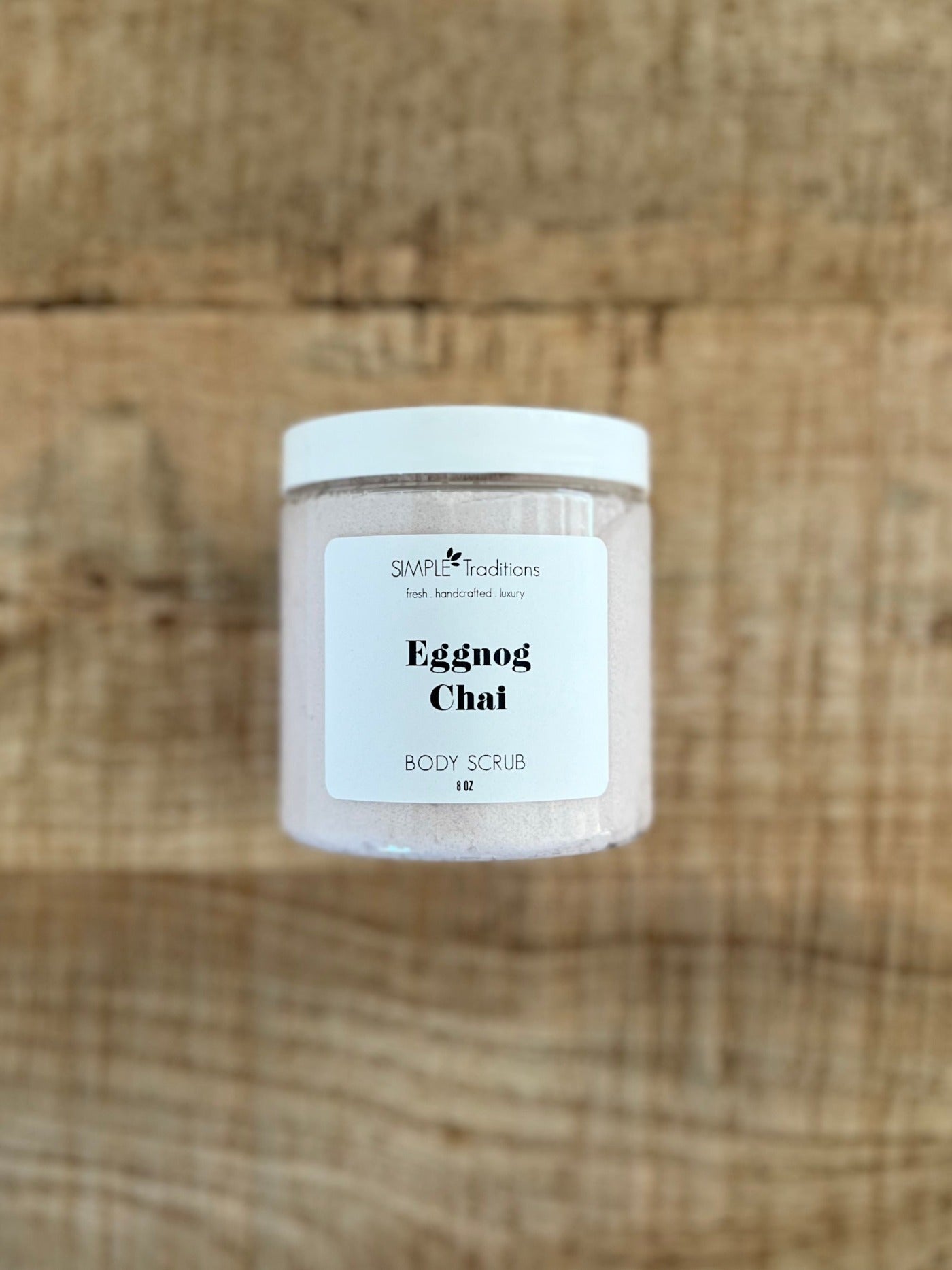 Indulge in the warm and cozy scent of Eggnog Chai with our luxurious sugar scrub. It has a rich aroma of spicy chai and creamy eggnog, that leaves your skin feeling soft and smooth.
